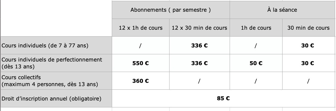 L'abonnement est semestriel. Les 12 périodes de cours (1 heure ou 30 min) qu'il comprend sont réparties soit de septembre à janvier inclus, soit de février à juin (voir calendrier).Les cours individuels au niveau débutant ne sont accessibles qu'aux élèves inscrits en cours collectifs.